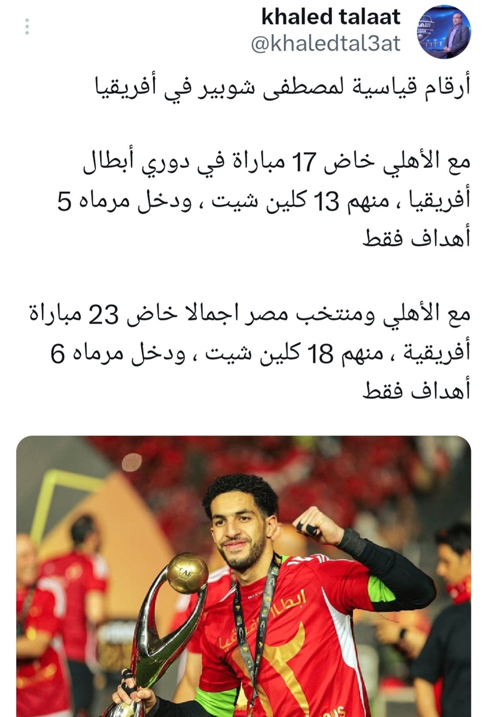 في تغريدة له عبر حسابه على منصة «إكس»، قال طلعت إن مصطفى شوبير لعب مع الأهلي 17 مباراة في دوري أبطال أفريقيا، وخرج بشباك نظيفة في 13 مباراة، واستقبل مرماه 5 أهداف فقط.