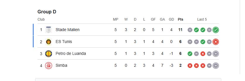 وبكده، استاد مالي تصدر المجموعة الرابعة برصيد 11 نقطة، في حين توقف رصيد الترجي عند 6 نقاط في المركز الثاني، وبيترو أتلتيكو الأنجولي ثالثا بنفس الرصيد، وسيمبا التنزاني في المركز الرابع بنقطتين.