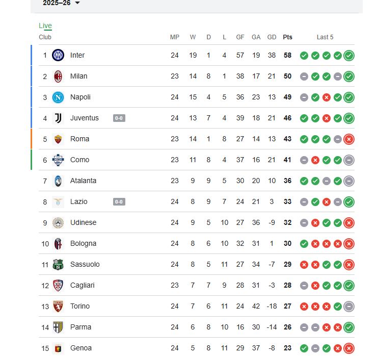 بهذا الفوز، رفع إنتر ميلان رصيده إلى 58 نقطة في صدارة الدوري، بفارق 8 نقاط عن أقرب ملاحقيه ميلان الذي يملك 50 نقطة، بينما يأتي نابولي في المركز الثالث بـ49 نقطة.