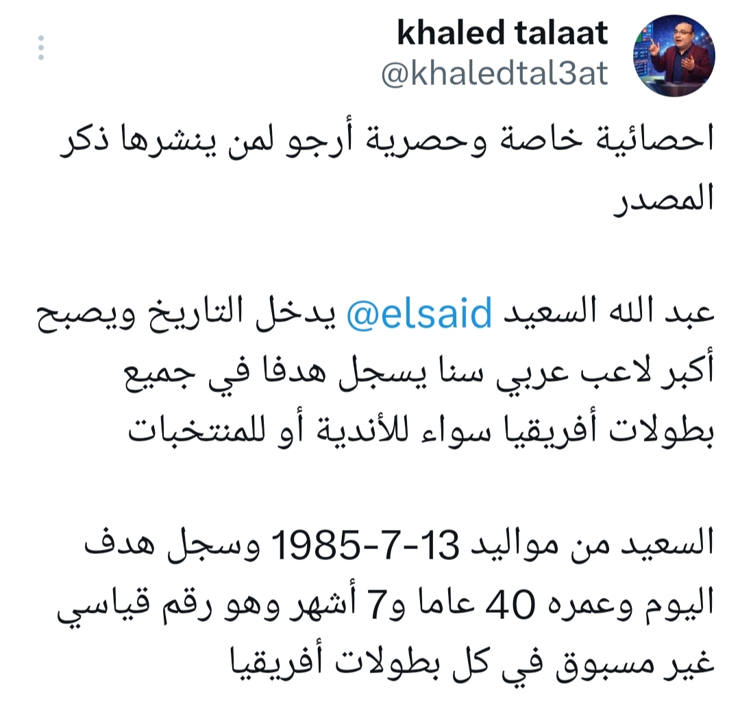 الإعلامي خالد طلعت كشف عن إحصائية خاصة توضح أن السعيد سجل هدفه وهو في عمر 40 عاماً و7 أشهر، وهو رقم قياسي لم يتحقق من قبل في تاريخ البطولات الأفريقية، وبكده السعيد مش بس سجل هدفه، لكنه كمان دخل قائمة أساطير الكرة المصرية.