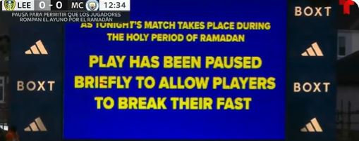 في الشوط الأول، توقفت المباراة لدقائق، حيث اجتمع اللاعبون المسلمون من الفريقين، وفي مقدمتهم الأمير المصري عمر مرموش، على خط الملعب لكسر صيامهم في يوم 10 من شهر رمضان المبارك 2026.