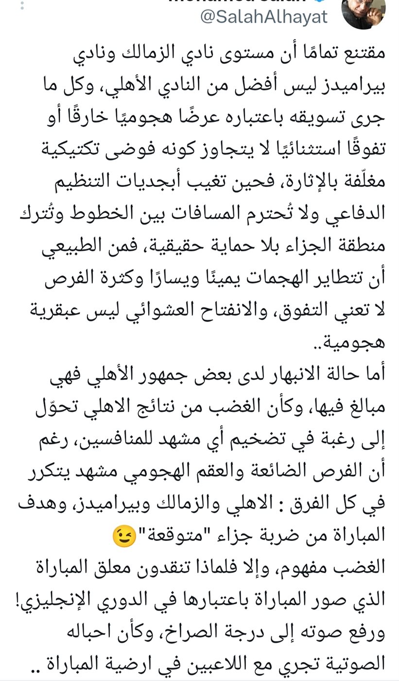 وفي نفس السياق، وصف صلاح انبهار بعض جمهور الأهلي بمستوى الزمالك وبيراميدز إنه مبالغ فيه، ورأى إن الغضب من نتائج الأهلي الأخيرة خلى البعض يضخم مشهد المنافسين، رغم إن كل الفرق بتعاني من نفس الأزمات الفنية في العقم الهجومي والفرص الضائعة.