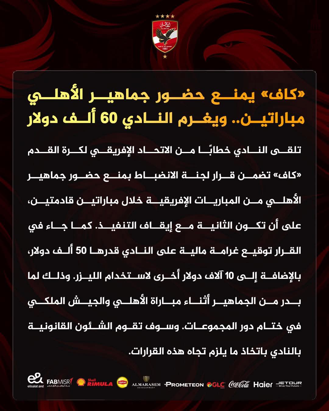 الأهلي حصل على خطاب من الاتحاد الإفريقي لكرة القدم، بخصوص عقوبات بعد أحداث مباراة الجيش الملكي. العقوبات تشمل منع الجماهير من حضور مباراتين قادمتين وغرامة مالية كبيرة.
