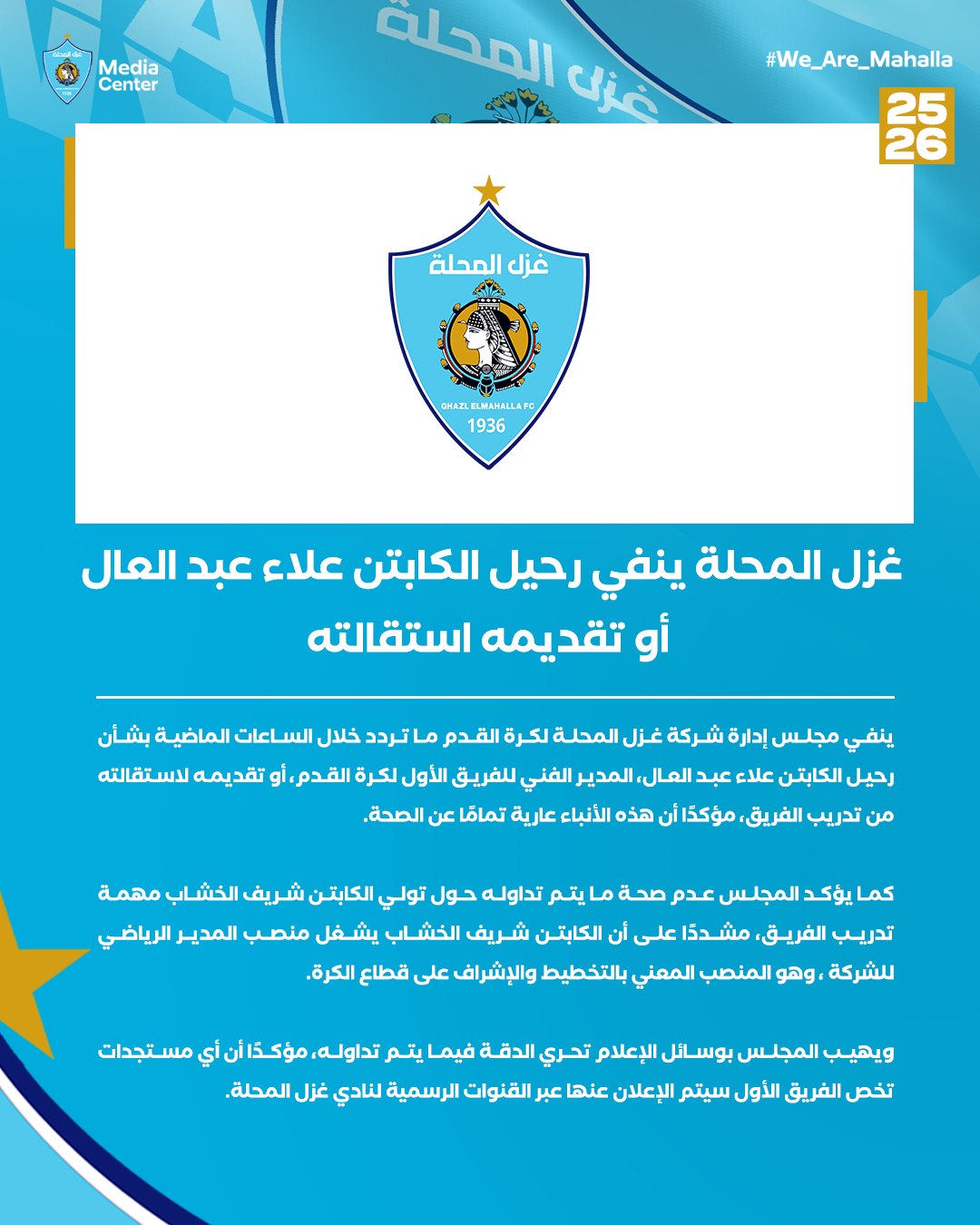 غزل المحلة طمأن جمهوره بعد أن انتشرت أخبار عن إقالة مدربه علاء عبد العال، حيث نفى النادي بشكل قاطع أي شائعات بهذا الخصوص، مؤكدًا أن هذه الأنباء غير صحيحة بالمرة.