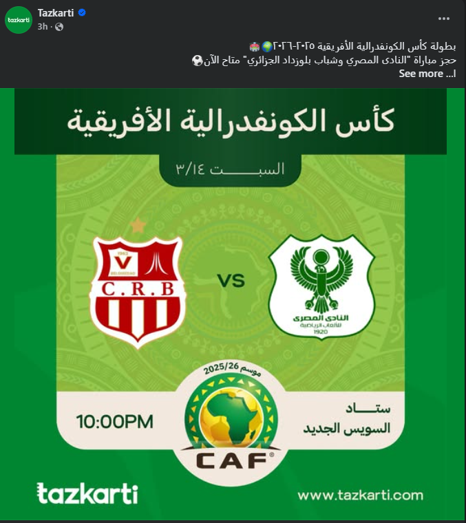 شركة «تذكرتي» أعلنت عن طرح تذاكر مباراة المصري البورسعيدي وشباب بلوزداد الجزائري، ضمن منافسات كأس الكونفدرالية الأفريقية والكل مستني الحدث الكبير ده.