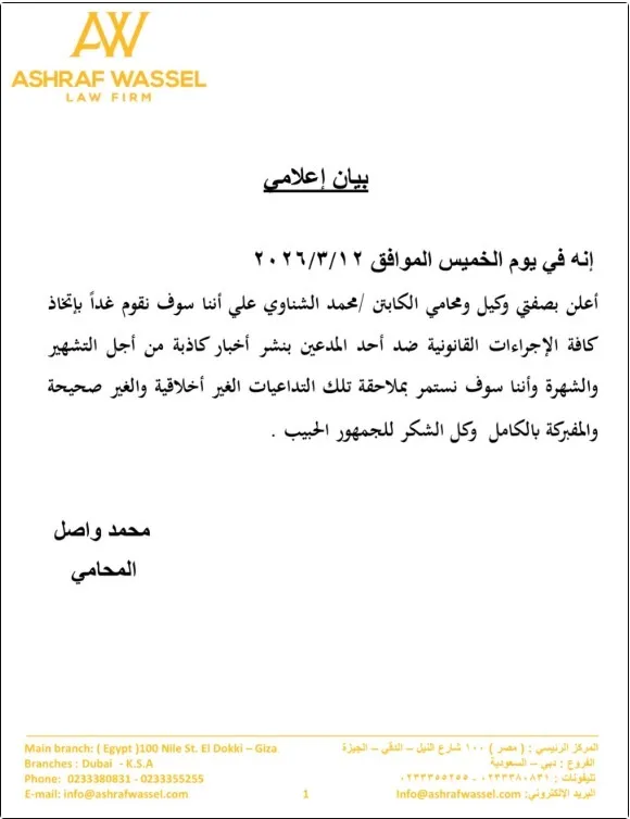 بعد ساعات قليلة، أصدر مكتب محمد واصل محامي الشناوي بيانًا رسميًا، أكد فيه إنهم هيتخذوا كافة الإجراءات القانونية ضد أي شخص بينشر أخبار كاذبة للتشهير والشهرة.