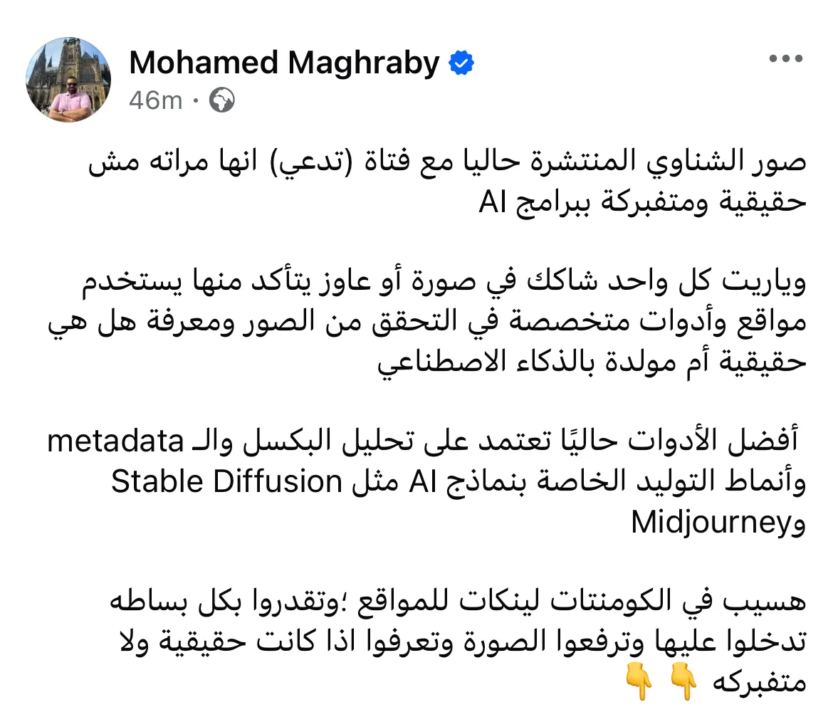 كتب مغربي عبر صفحته إن الصور المنتشرة مش حقيقية ومتفبركة ببرامج AI، وطلب من الناس يستخدموا مواقع متخصصة للتحقق من الصور.