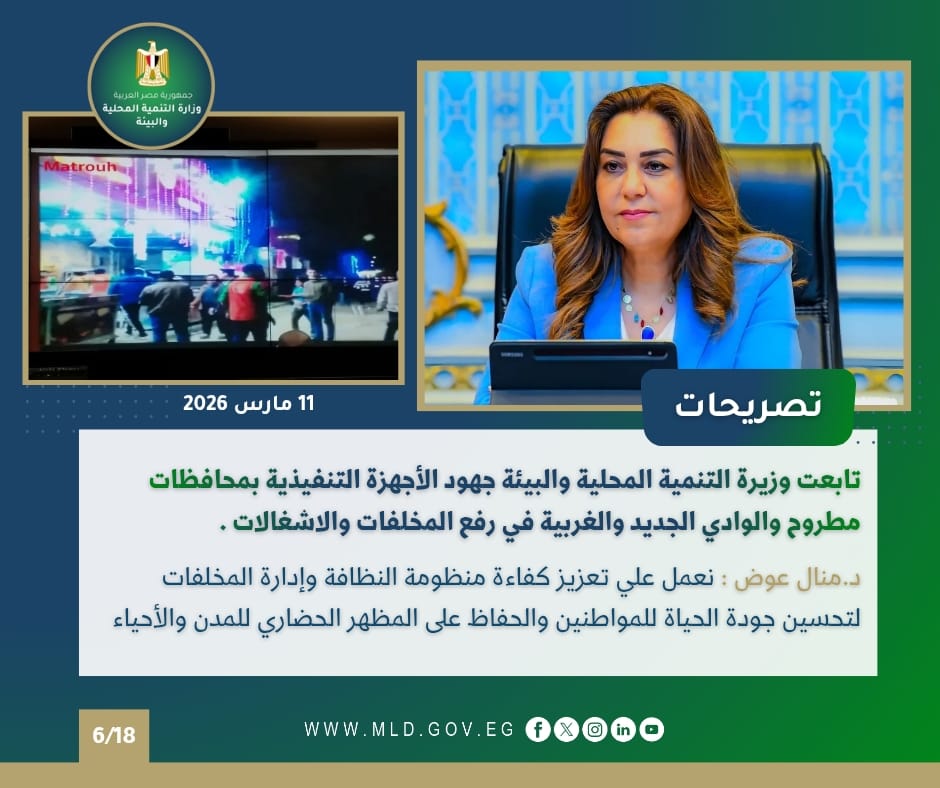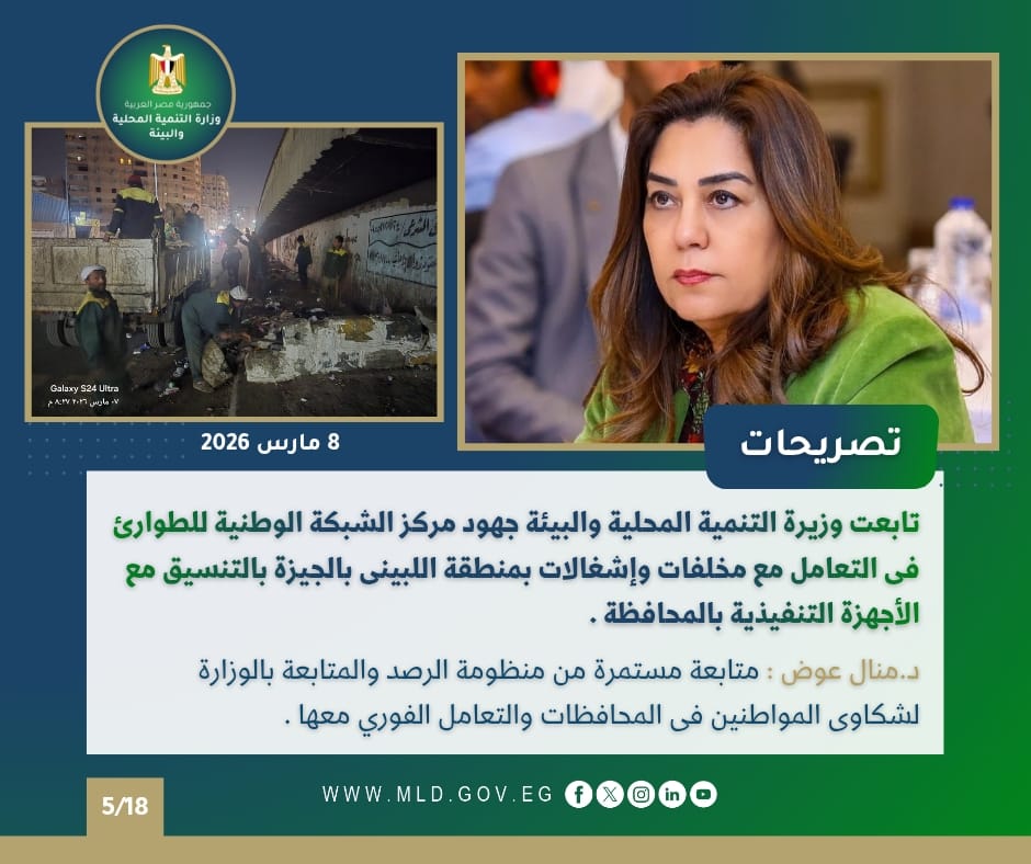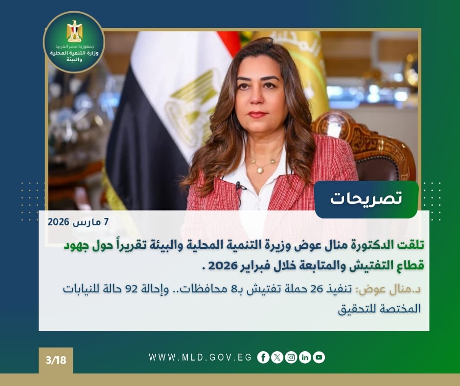 تلقت الوزيرة تقريرًا عن جهود قطاع التفتيش والمتابعة خلال فبراير 2026، حيث تم تنفيذ 26 حملة تفتيشية في 8 محافظات، منها القاهرة والجيزة، لضبط الأداء وتحسين الخدمات المقدمة للمواطنين، كما رصد المركز الوطني للطوارئ وجود تجمعات لمخلفات مباني في منطقة المنيرة بحي إمبابة، واستغاثات من أهالي الفيوم حول تراكم القمامة في المجاري المائية.