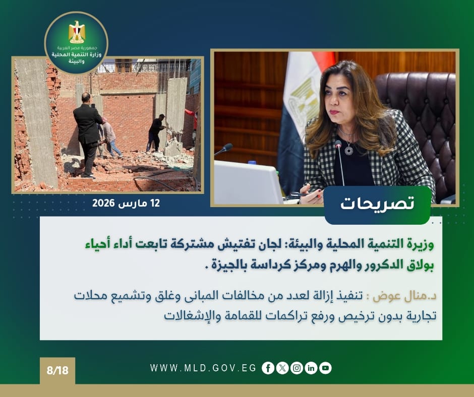 أعلنت الوزيرة عن قيام لجنة مشتركة بالمرور على وحدات محلية في الجيزة لمتابعة المخالفات، وترأست اجتماع مشروع تعزيز التكيف مع تغير المناخ، كما استقبلت محافظ دمياط لمتابعة تنفيذ توجيهات رئيس الجمهورية بشأن تحسين الخدمات المقدمة للمواطنين.