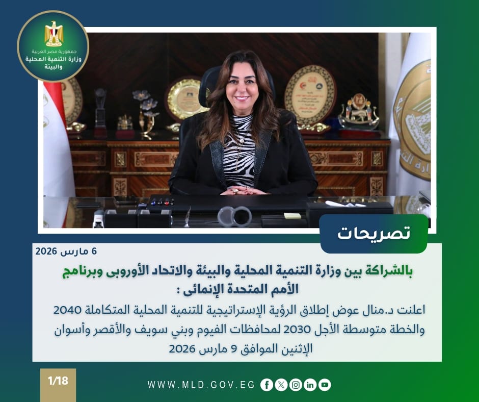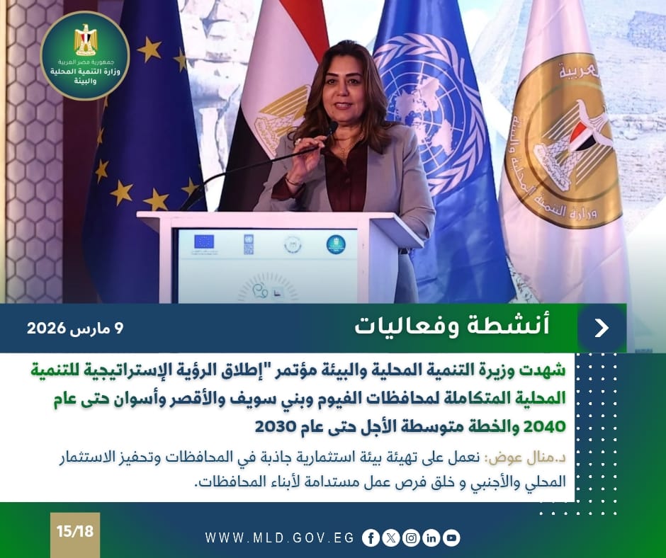 أعلنت الدكتورة منال عوض وزيرة التنمية المحلية والبيئة عن تنظيم مؤتمر لإطلاق “الرؤية الإستراتيجية للتنمية المحلية المتكاملة 2040” والخطة متوسطة الأجل حتى 2030 لمحافظات الفيوم وبني سويف والأقصر وأسوان يوم الاثنين 9 مارس 2026، المؤتمر سيكون برئاسة مشتركة بين الوزارة والاتحاد الأوروبي وبرنامج الأمم المتحدة الإنمائي، ويشهد حضور ممثلي عدة وزارات ومحافظين وممثلين عن المجتمع المدني والمستثمرين، وذلك للترويج للفرص الاستثمارية والمشروعات التنموية.