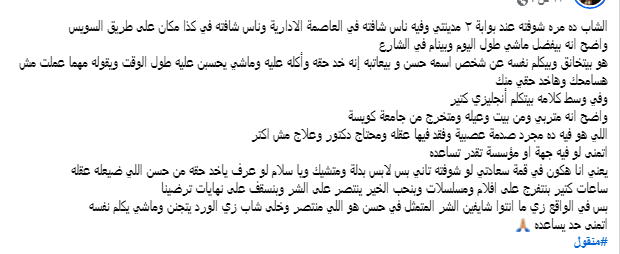 شهود عيان ذكروا أنه يسير طوال اليوم وينام في الشوارع، ويدخل في مشادات حادة مع شخص غير موجود يدعى “حسن”. ووفقًا للمنشور المتداول، فإن الشاب يوجه اتهامات قاسية لـ “حسن” بأنه استولى على حقوقه و”أكل ماله”، ويستمر في التذكير بأنه لن يسامحه وسيأخذ حقه منه.