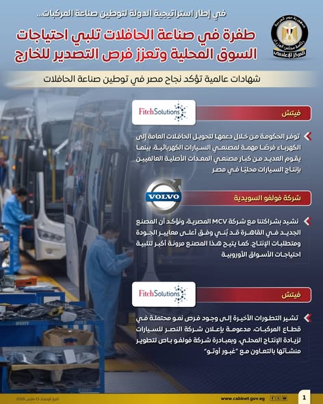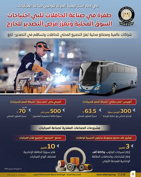 نشر المركز الإعلامي لمجلس الوزراء مجموعة من الإنفوجرافات على منصاته الرسمية، وركزت على التطورات الكبيرة في صناعة الحافلات بمصر، وكيف ساهمت هذه التطورات في تلبية احتياجات السوق المحلي وتعزيز فرص التصدير، وذلك ضمن استراتيجية الدولة لتوطين صناعة المركبات وزيادة التصنيع المحلي.