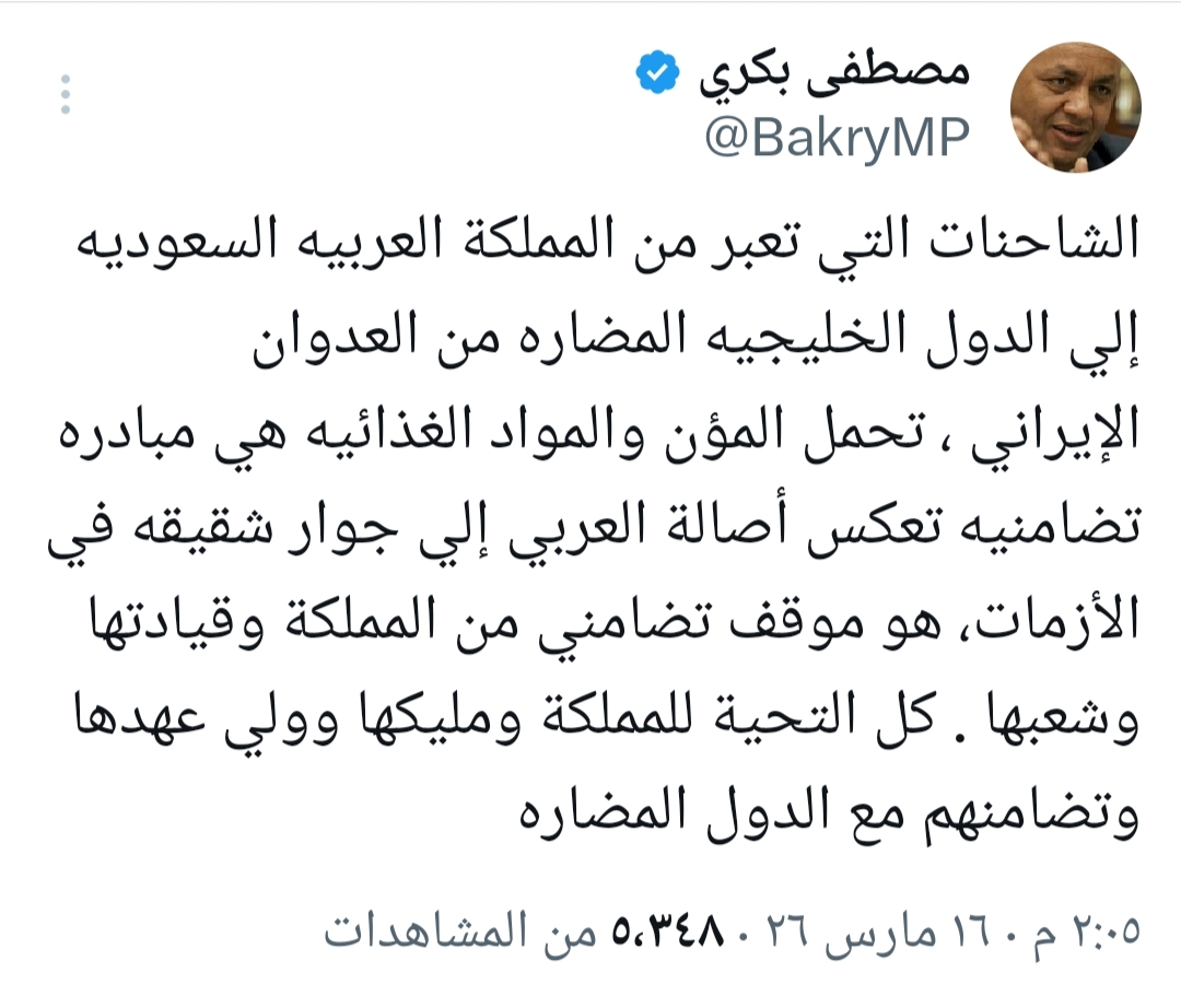 وفي تغريدة له على منصة “إكس”، أوضح بكري أن الشاحنات السعودية التي تعبر الحدود حاليًا إلى الدول الخليجية المتضررة من العدوان الإيراني محملة بالمؤن والمواد الغذائية، تأتي في إطار مبادرة إنسانية شاملة.