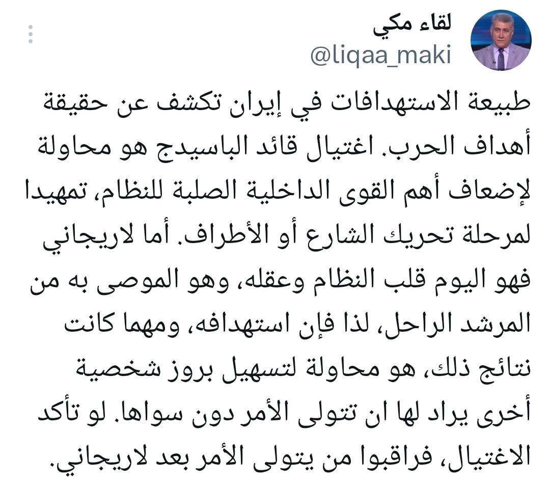 واختتم مكي تحليله بدعوة المراقبين لمتابعة التحركات القادمة، مشيرا إلى أنه إذا تأكد الاغتيال، يجب مراقبة من سيتولى الأمور بعد لاريجاني، مما يدل على وجود مخطط لإعادة ترتيب الحكم من الداخل عبر إزاحة الركائز الأساسية للنظام الحالي.