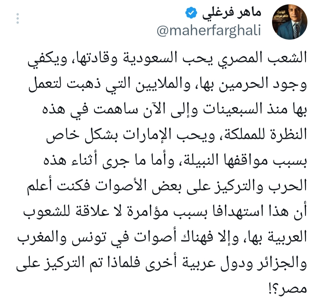 وأشار فرغلي في تغريدة له عبر حسابه على منصة “إكس” إلى أن المصريين يكنون محبة خاصة للمملكة العربية السعودية، حيث إن وجود الحرمين الشريفين هناك يمنحها مكانة خاصة في قلوبهم. كما أكد أن ملايين المصريين الذين عملوا في السعودية منذ السبعينيات ساهموا في تعزيز الروابط بين البلدين.