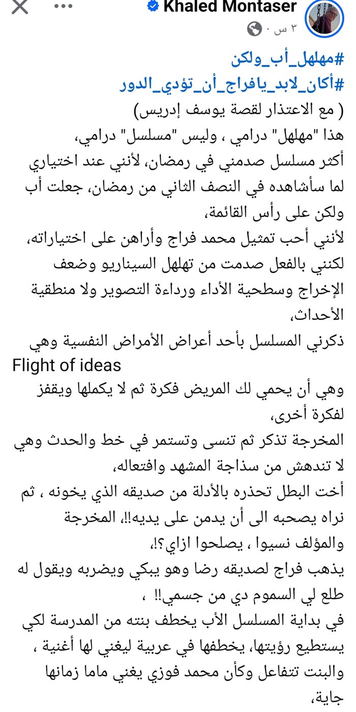 في نقد حاد أثار جدلاً كبيراً، عبّر الكاتب الدكتور خالد منتصر عن استيائه من مسلسل “أب ولكن”، واصفاً إياه بأنه “مهلهل” درامياً، منتقداً تراجع مستواه في كل الجوانب من سيناريو وإخراج وأداء تمثيلي.