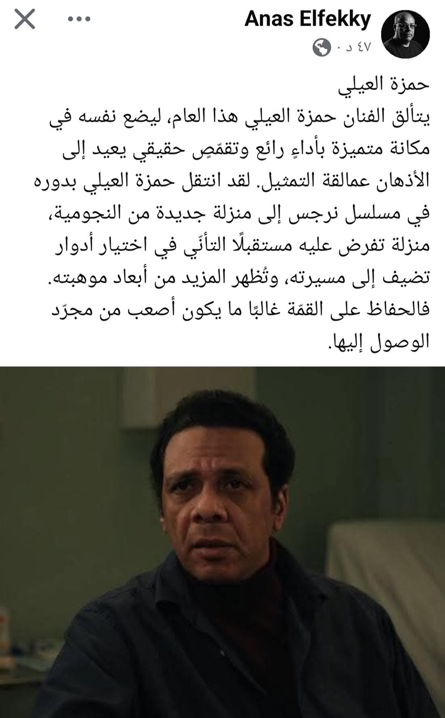 كتب الفقي على حسابه على “الفيس بوك” أن العيلي استطاع أن يضع نفسه في مكانة بارزة بفضل تأديته المميزة، وهو أداء أعاد إلى الأذهان عمالقة الفن في مصر. وأشار إلى أن حمزة العيلي انتقل بمسيرته إلى مرحلة جديدة من النجومية، وهو ما يضع عليه مسؤولية كبيرة في اختياراته المستقبلية.