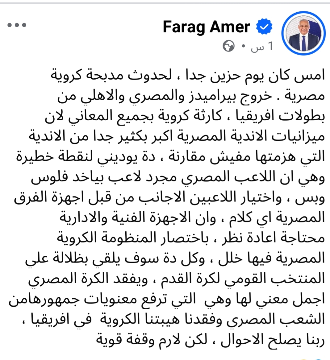 وعبر عامر، في منشور على فيسبوك، عن استيائه من النتائج المخيبة للآمال، وذكر أن ميزانيات الأندية المصرية أعلى بكتير من الأندية اللي خلتها تتخسر، وأكد إنه مفيش مقارنة من الناحية المالية.