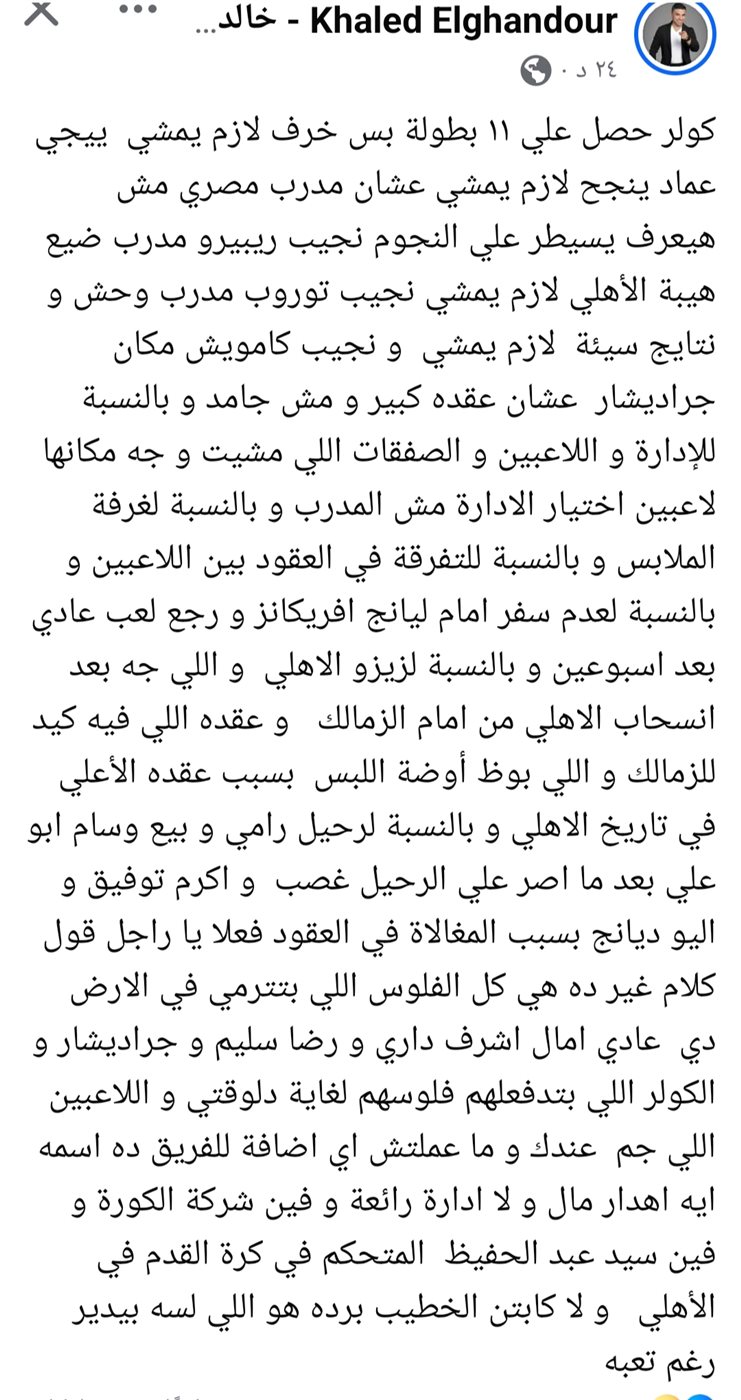 الزياتي أكد عبر حسابه على منصة “إكس” أن رحيل توروب بات مسألة وقت، وأشار إلى ضرورة رحيله حتى لو كلف النادي ملايين الدولارات، واصفاً إياه بأنه “ضعيف جداً تكتيكياً”.