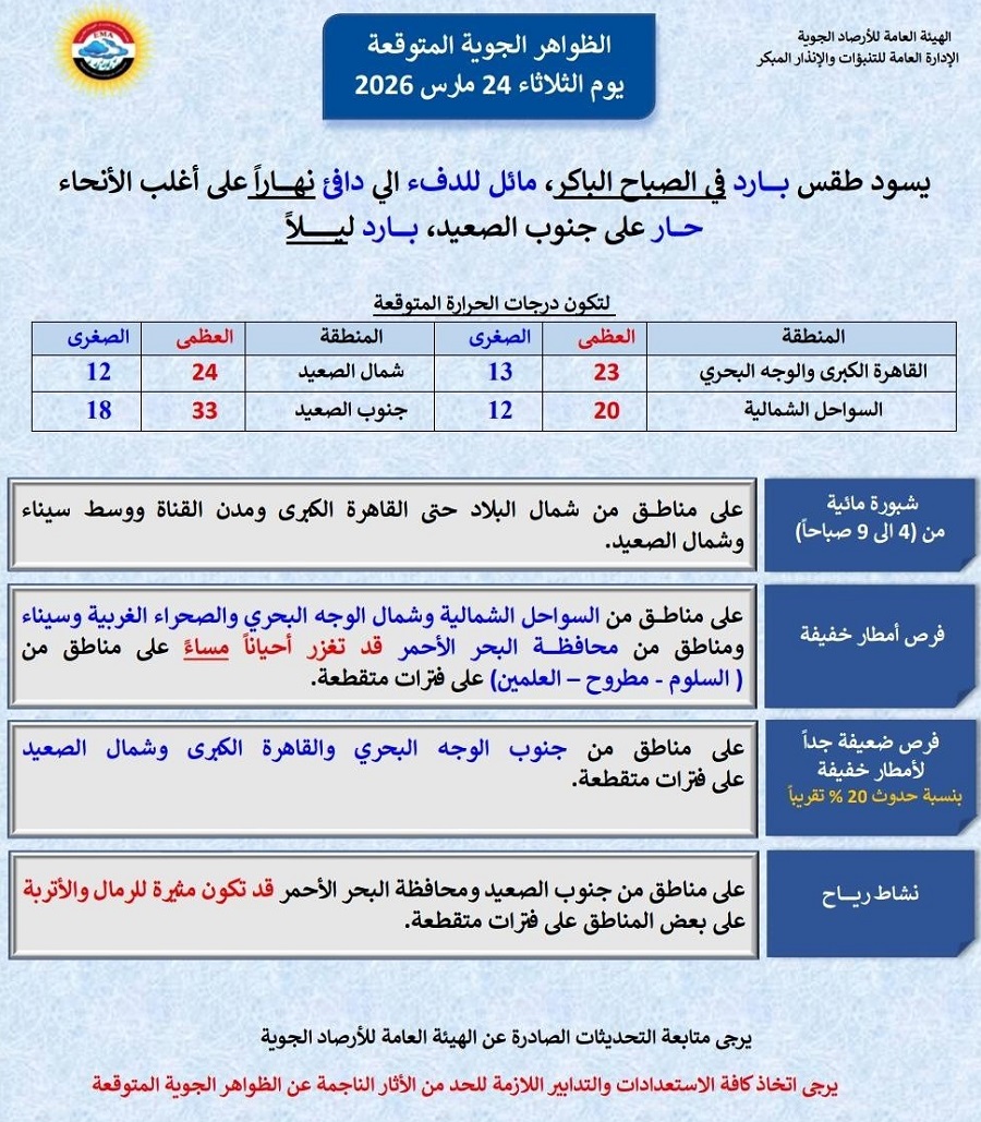 كشفت الهيئة العامة للأرصاد الجوية عن تفاصيل حالة الطقس المتوقع غداً الثلاثاء 24 مارس 2026، حيث يستمر الطقس غير المستقر في البلاد، مع أجواء باردة في الصباح، وطقس دافئ نهاراً في معظم المناطق، بينما يكون حاراً في جنوب الصعيد وبارداً ليلاً.