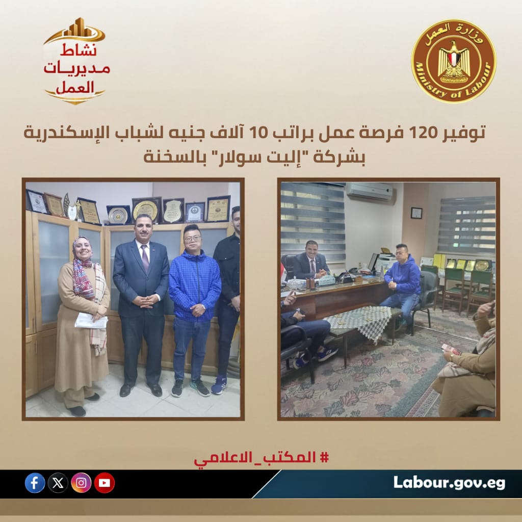 استقبل عبد الونيس عبد الله، مدير مديرية عمل الإسكندرية، Liu، مدير مشروع شركة “إليت سولار” للطاقة الشمسية في منطقة “تيدا” الصناعية. تم الاتفاق على توفير 120 فرصة عمل لعمال إنتاج (ذكور) براتب يبدأ من 10,000 جنيه، مع توفير سكن للمغتربين ووجبتين يوميًا وكافة المزايا التأمينية. حضر اللقاء مسؤولو الموارد البشرية بالشركة ومديرة إدارة بحوث العمالة، لتعزيز التعاون وتأمين مستقبل الشباب في المحافظة.