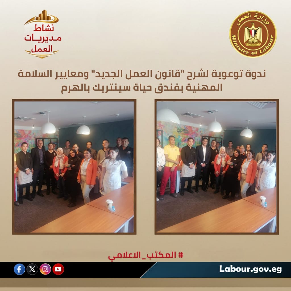 نظمت مديرية عمل الجيزة، بقيادة كريم أبوالسعود، ندوة تثقيفية بمقر فندق “حياة سينتريك”. تناولت الندوة، التي ألقتها الكيميائية رباب عويس، أهداف السلامة والصحة المهنية ومستجدات قانون العمل رقم 14 لسنة 2025. اختتمت الفعالية بالتأكيد على تكرار الندوات لتعزيز الوعي القانوني وتوفير بيئة عمل آمنة تدعم رؤية مصر 2030 وأهداف التنمية المستدامة بمركز الهرم.