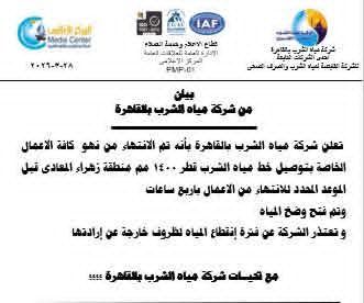 وكانت شركة المياه قد أعلنت أن أعمال تجديد الخط ستؤدي إلى قطع المياه عن مناطق مدينة نصر، ما عدا منطقة زهراء مدينة نصر، ومنطقة منشأة ناصر، والتجمع الثالث بالقاهرة الجديدة، اعتبارًا من الساعة الرابعة مساء يوم الجمعة الموافق 27-3-2026 ولمدة 24 ساعة.