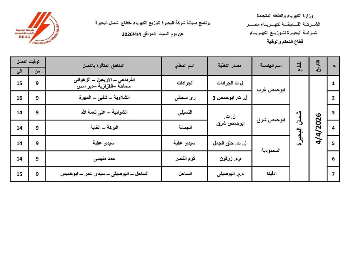 وفي أبو حمص شرق، سيكون الفصل من التاسعة صباحاً حتى 2 ظهراً عن الشوانية وعلى نعمة الله والبركة والغابة، بينما في مركز المحمودية سيتم فصل التيار من 9 صباحاً حتى 2 ظهراً عن مناطق سيدي عقبة وحمد منيسي.