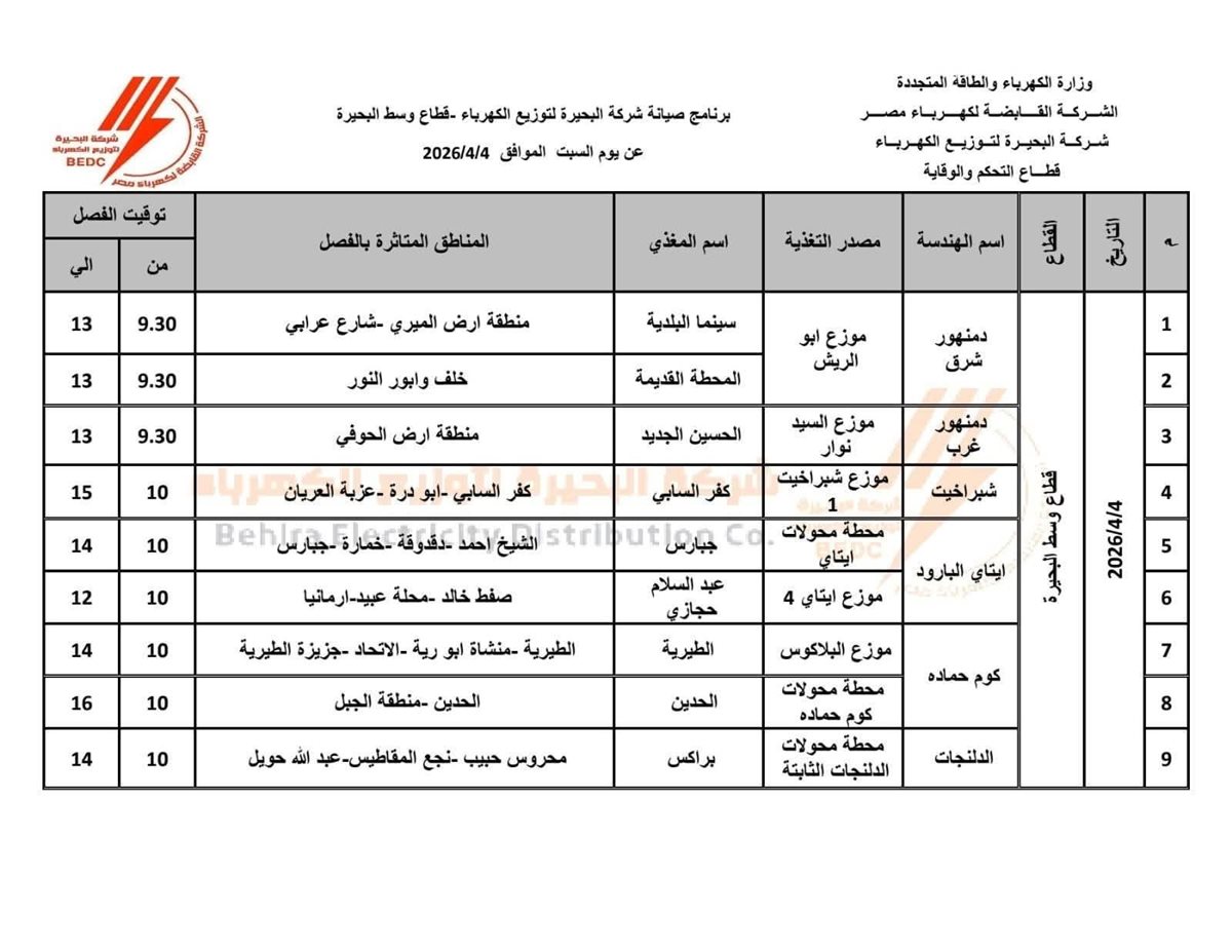 وبالنسبة لمركز شبراخيت، سيكون الفصل من 10 صباحاً حتى 3 عصراً عن كفر السابي وأبو درة وعزبة العريان، وفي مركز إيتاي البارود، سيقطع التيار من 10 صباحاً حتى 2 ظهراً في الشيخ أحمد ودقدوقة وخمارة وجبارس، ومن 10 صباحاً حتى 12 ظهراً في صفط خالد ومحلة عبيد وأرمانيا.