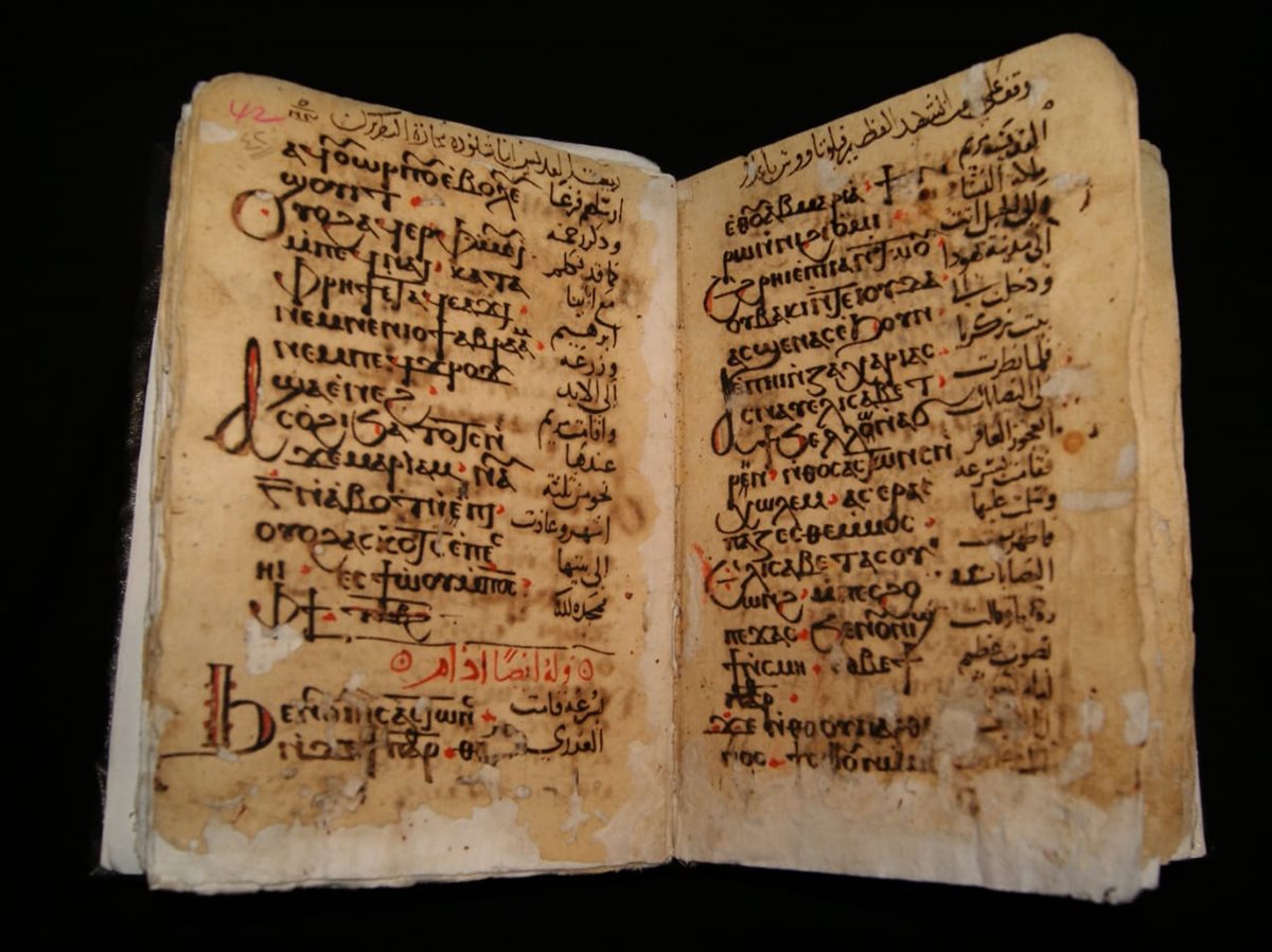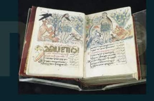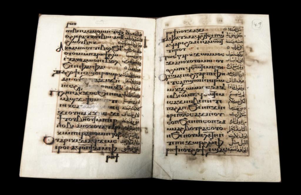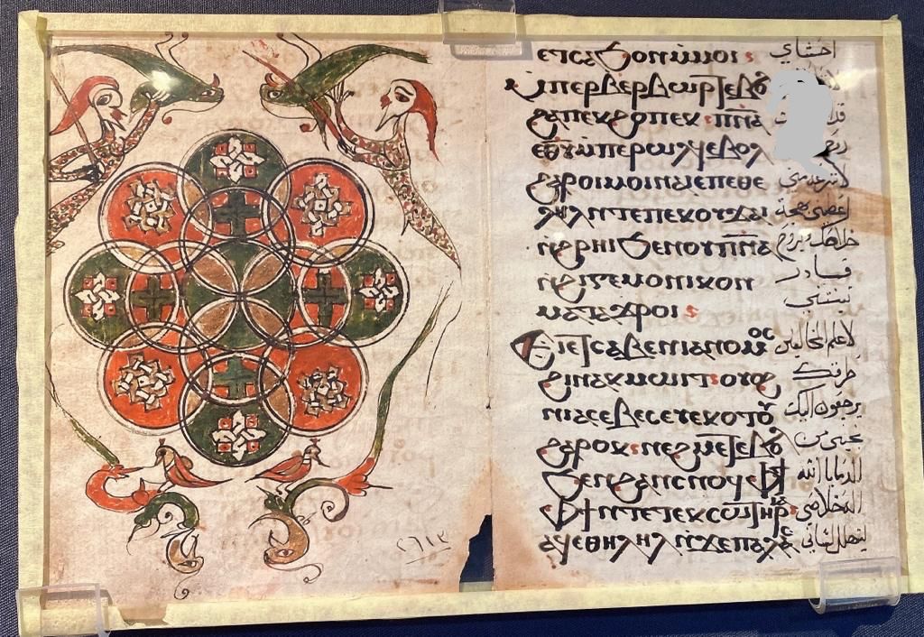 يعرض مخطوطًا باللغتين القبطية والعربية يحتوي على نصوص ليتورجية ورسوم رمزية، تعكس التفاعل الثقافي بين التراثين القبطي والإسلامي.