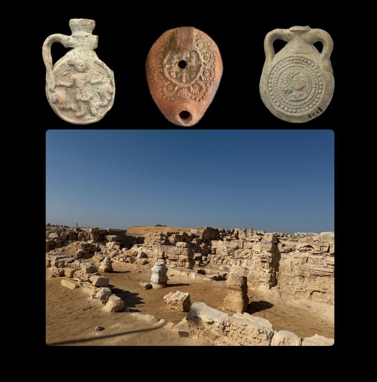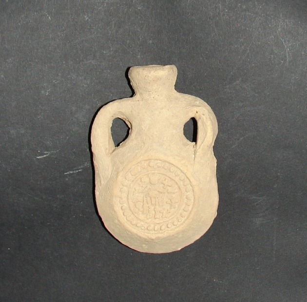 يعرض قنينة فخارية من موقع أبو مينا، يظهر على أحد وجهيها القديس مينا (مارمينا) في وضع تعبدي، محاطًا برموز الصلبان، بينما يحمل الوجه الآخر زخارف غير واضحة. القطعة تعود للفترة ما بين القرنين الرابع والسابع الميلاديين، وتم العثور عليها ضمن حفائر كرم أبو مينا.