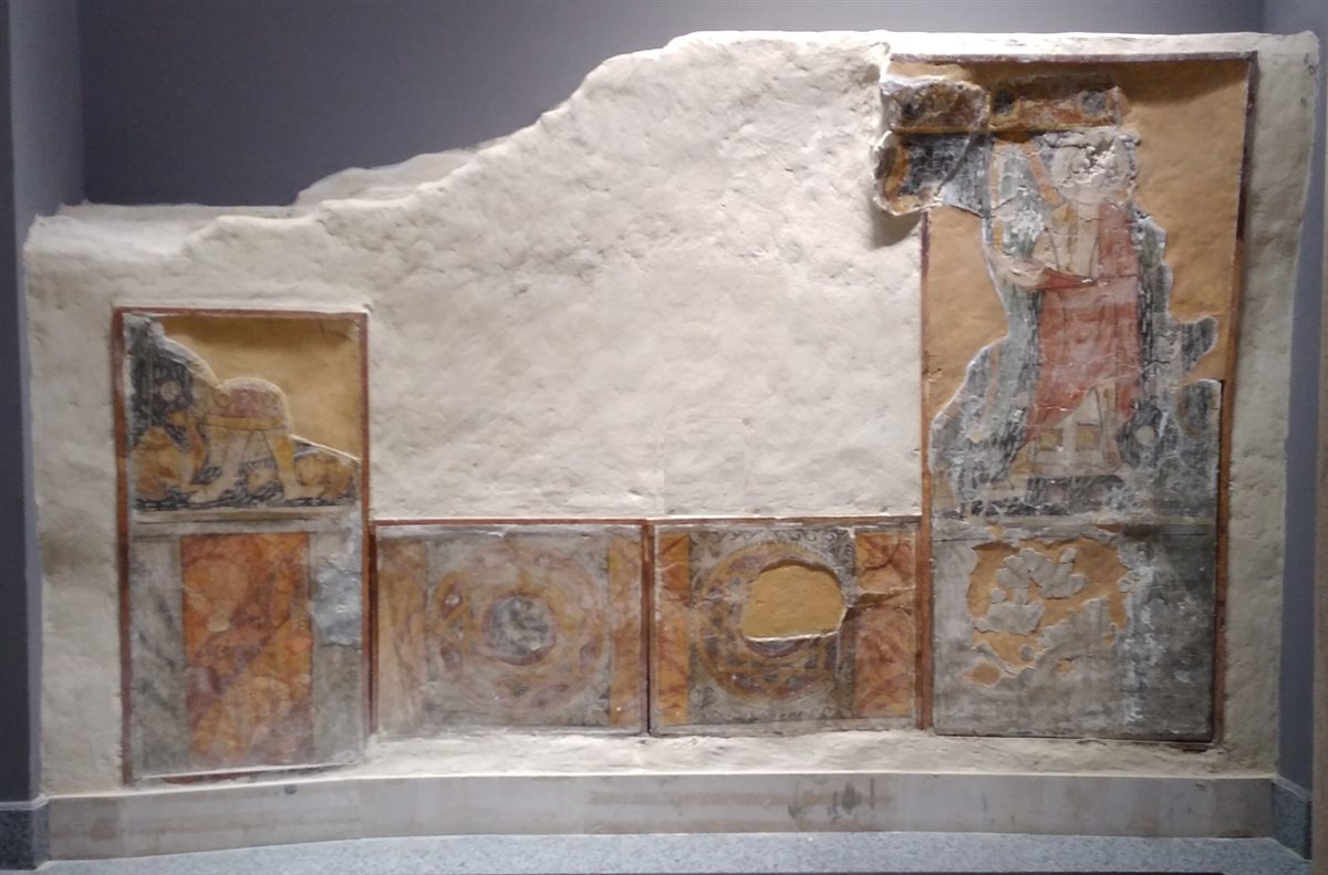 يعرض رسمًا جداريًا منفذًا بتقنية الفريسكو، يتضمن زخارف وصورًا دينية، من بينها مشهد للقديس مينا بين الجملين، مع قديس آخر محاط بهالة من النور، مما يمثل الفن القبطي المبكر.