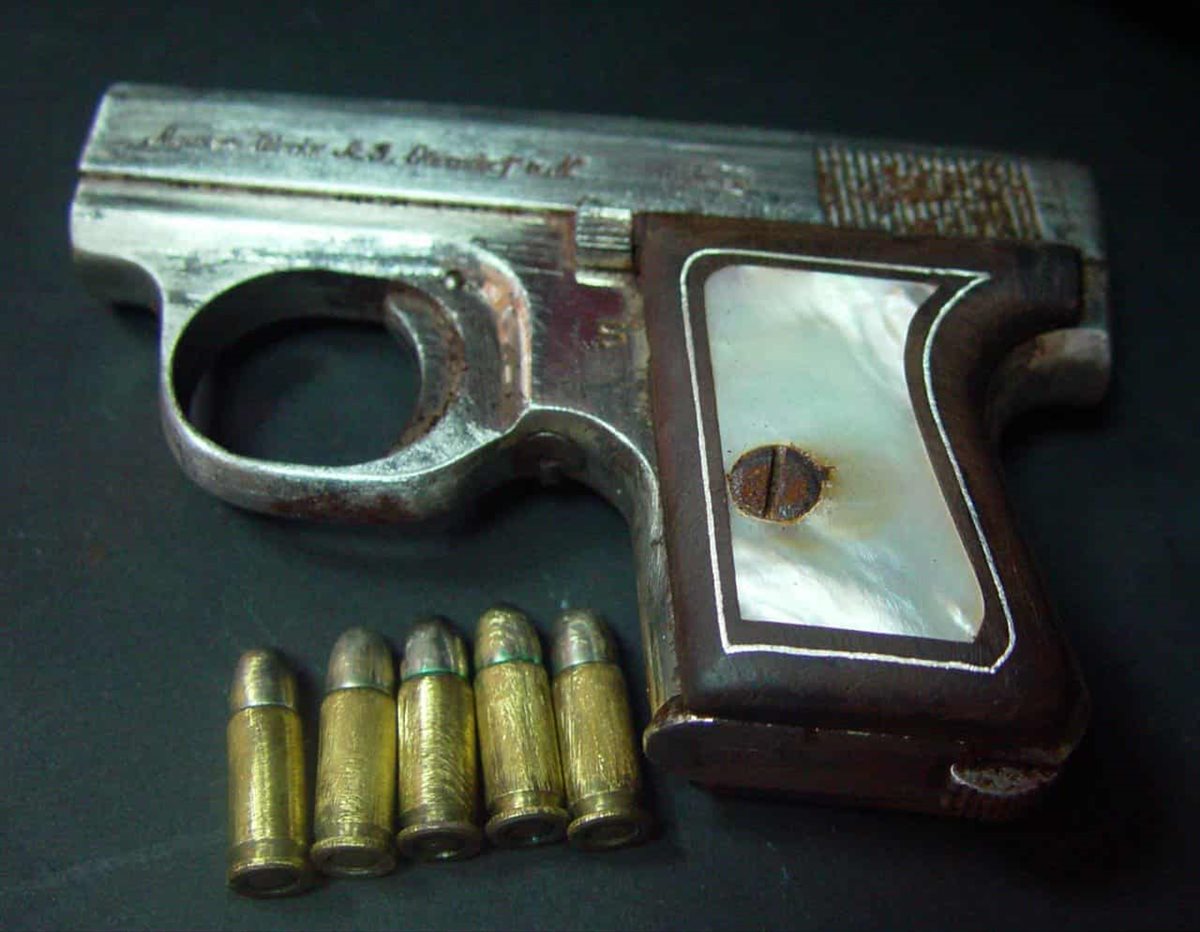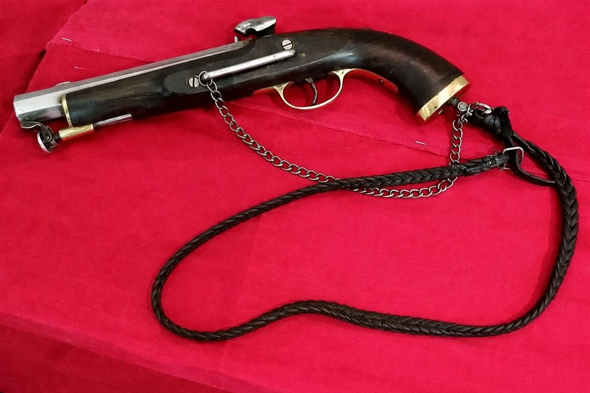 يعرض مسدسًا من طراز ماوزر مطعمًا بالصدف، من مقتنيات الملك فؤاد الأول، مما يعكس تطور الأسلحة الحديثة في العصر الملكي.