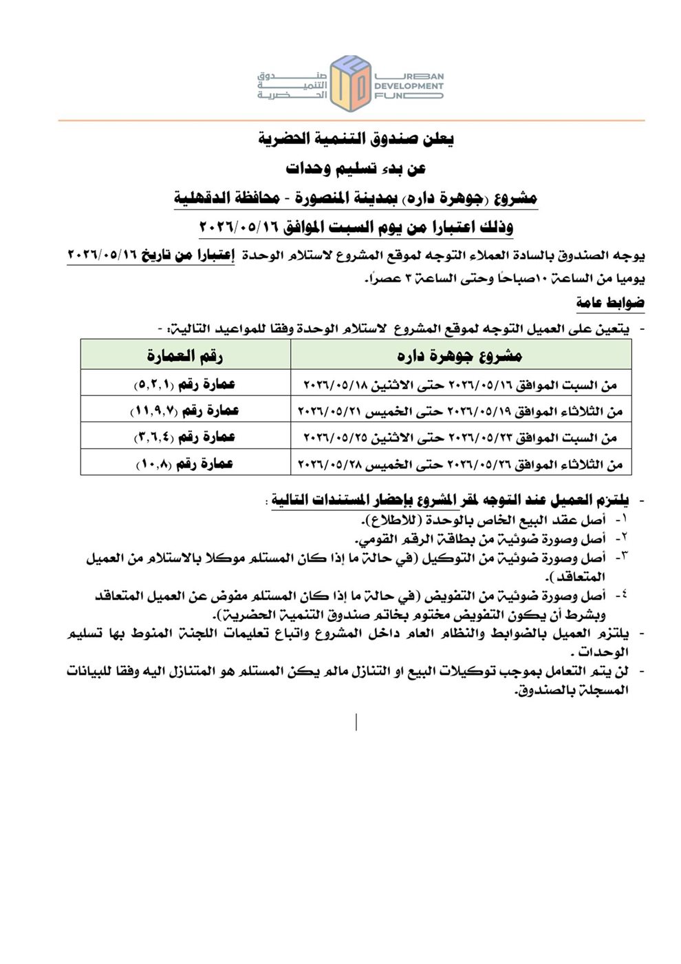 أعلن صندوق التنمية الحضرية عن بدء تسليم وحدات مشروع جوهرة دار في المنصورة، الدقهلية، يوم السبت 16 مايو 2026، مع وضع جدول خاص لتسهيل العملية على العملاء.