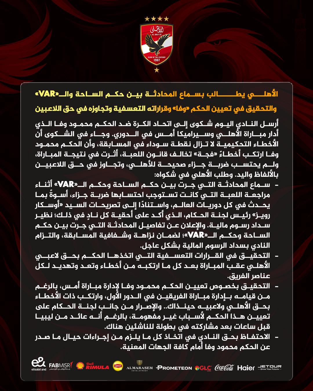 • الاحتفاظ بحق النادي في اتخاذ أي إجراءات تجاه الحكم محمود وفا أمام الجهات المعنية.