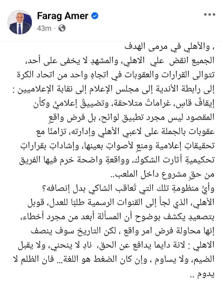 واستمر في القول: “أي منظومة تعاقب الشاكي بدلاً من إنصافه؟ الأهلي، الذي لجأ إلى القنوات الرسمية طلبًا للعدل، وجد تصعيدًا يكشف أن المسألة أبعد من الأخطاء، إنها محاولة فرض أمر واقع، لكن التاريخ سوف ينصف الأهلي لأنه يدافع دائمًا عن الحق، نادي لا ينحني ولا يقبل الضيم، ولا يساوم، وإن كان الضغط هو اللغة، فإن الظلم لا يدوم”