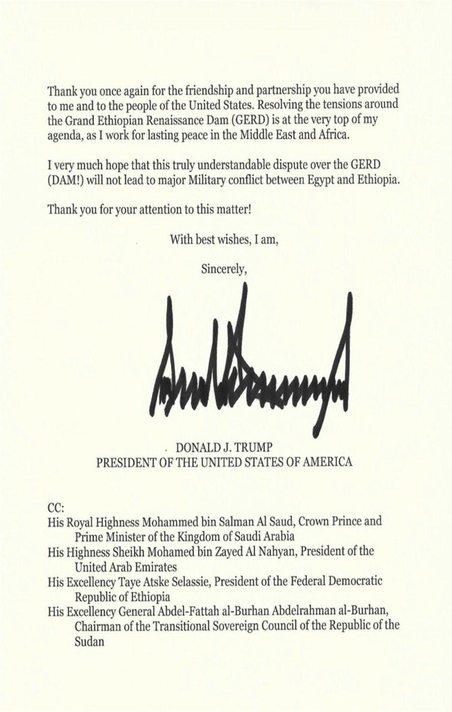 واختتم ترامب بالقول إن الولايات المتحدة تؤكد أنه لا ينبغي لأي دولة في المنطقة أن تسيطر بشكل منفرد على موارد النيل الثمينة، أو تلحق الضرر بجيرانها في هذه العملية.