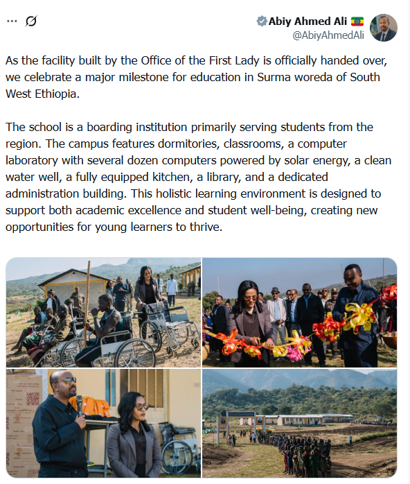 في آخر تغريدة له على منصة “إكس”، نشر آبي أحمد صورًا له مع زوجته، وعلق قائلاً: “مع تسليم المنشأة التي بناها مكتب السيدة الأولى، نحتفل بإنجاز هام في التعليم بمنطقة سورما بجنوب غرب إثيوبيا”.