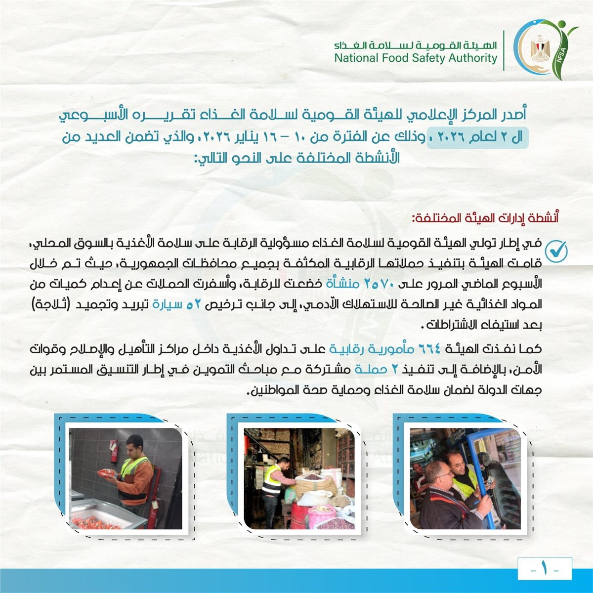 أصدر المركز الإعلامي للهيئة القومية لسلامة الغذاء تقريره الأسبوعي الثاني لعام 2026، والذي يغطي الفترة من 10 إلى 16 يناير. التقرير يتضمن أنشطة متعلقة بسلامة الغذاء في مختلف المحافظات.