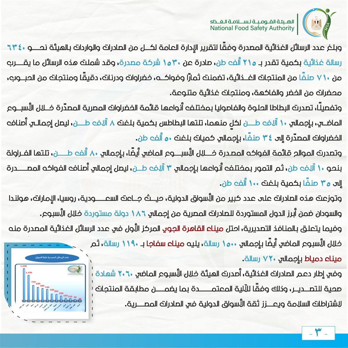 بلغ عدد الرسائل الغذائية المصدرة 6340 رسالة بكمية تصل إلى 215 ألف طن، من 1530 شركة مصدرة. شملت هذه الرسائل حوالي 710 صنفًا من المنتجات الغذائية، مثل الفواكه والخضراوات والدقيق. تصدرت البطاطا الحلوة والفاصوليا قائمة الخضراوات المصدَّرة، بينما كانت الموالح في مقدمة الفواكه المصدرة. جاءت السعودية وروسيا والإمارات وهولندا والسودان ضمن أبرز الدول المستوردة، بينما احتل ميناء القاهرة الجوي المركز الأول في عدد الرسائل المصدرة.