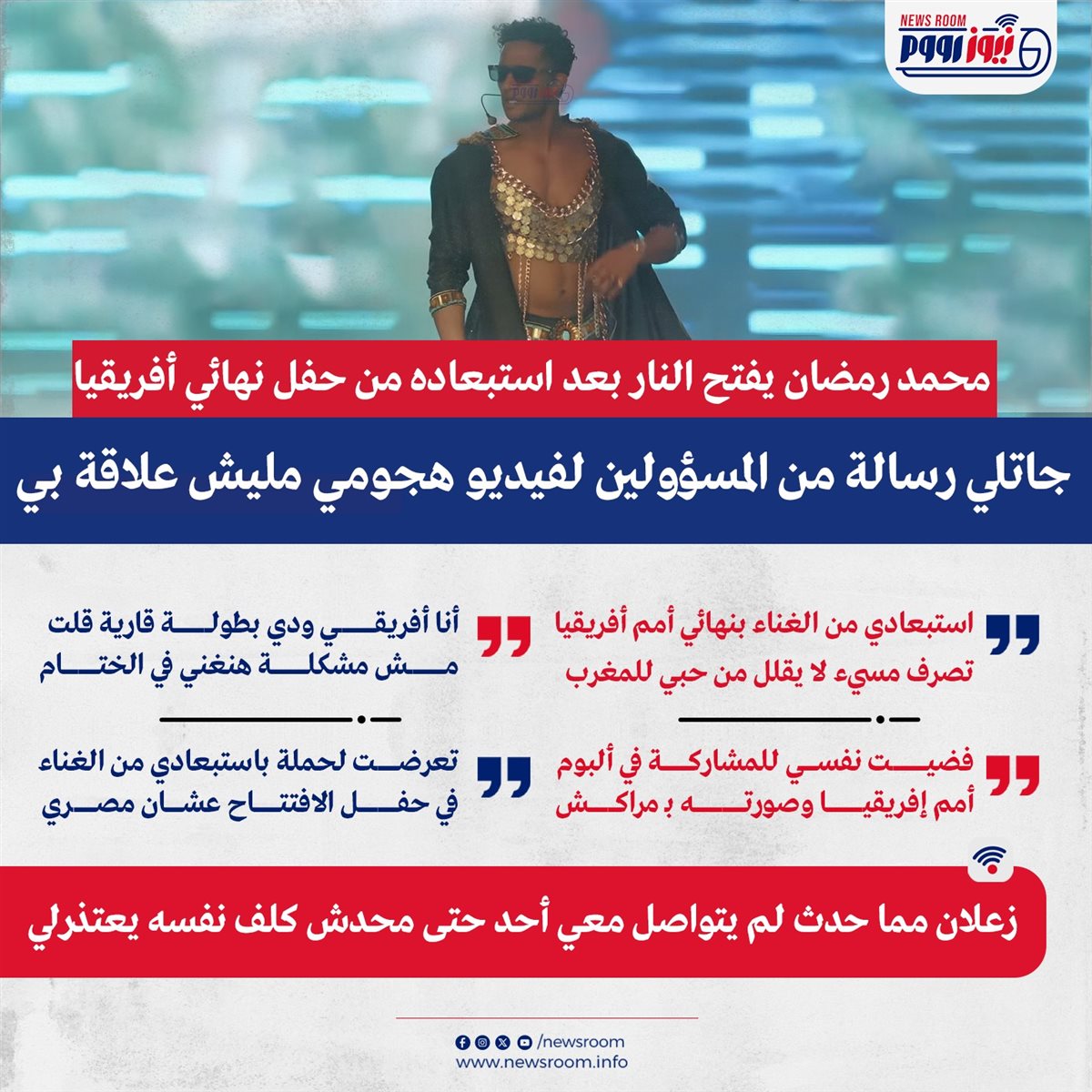 كان من المفروض أن محمد رمضان يكون ضمن الفنانين المشاركين، لكن تم استبعاده بعد فيديو هاجم فيه الجماهير المغربية، ورغم حزنه، أكد إنه علاقته مع الشعب المغربي مش هتتأثر بأي حاجة.