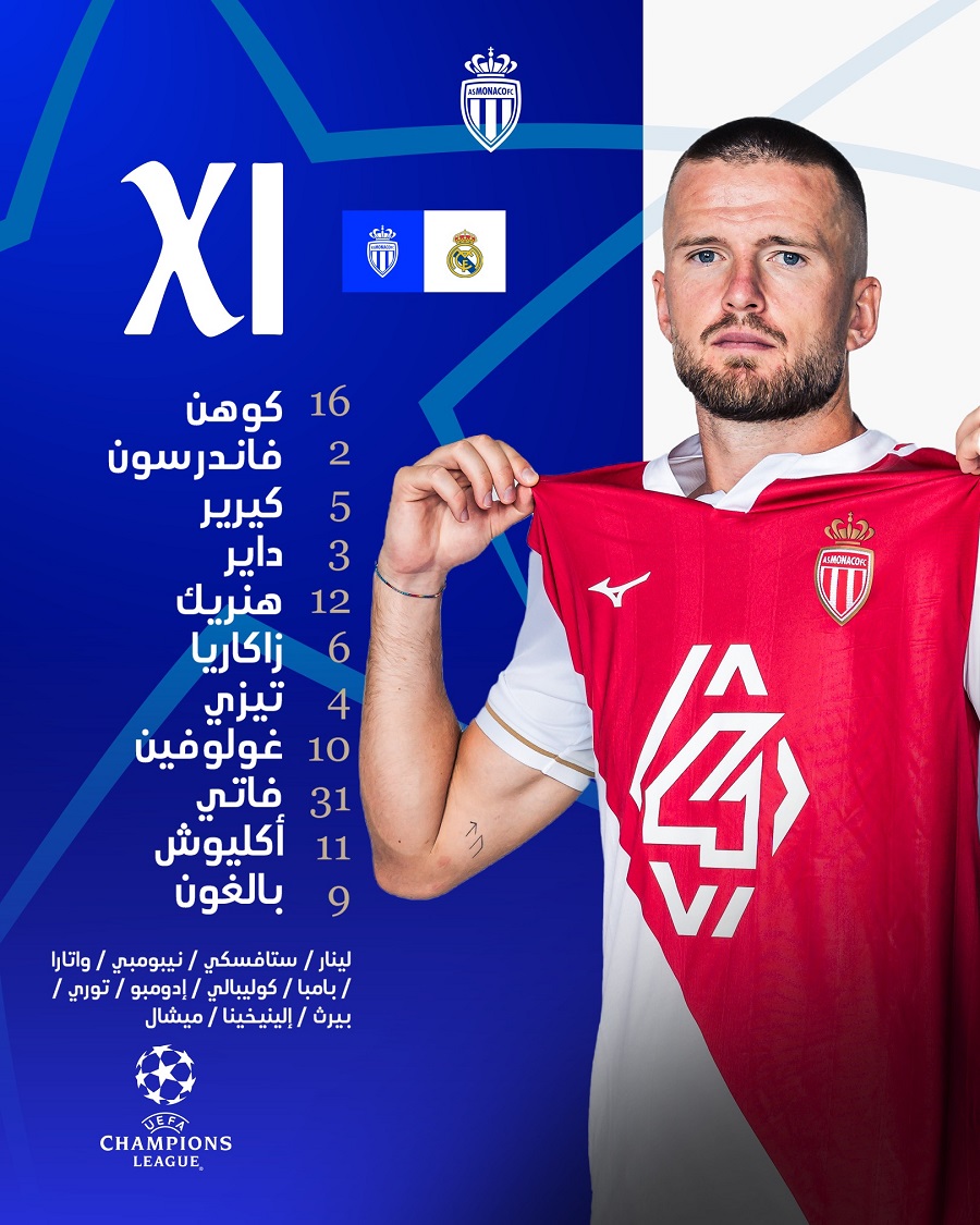 التشكيل الرسمي لـ مباراة ريال مدريد وموناكو اليوم في دوري أبطال أوروبا 2025-26