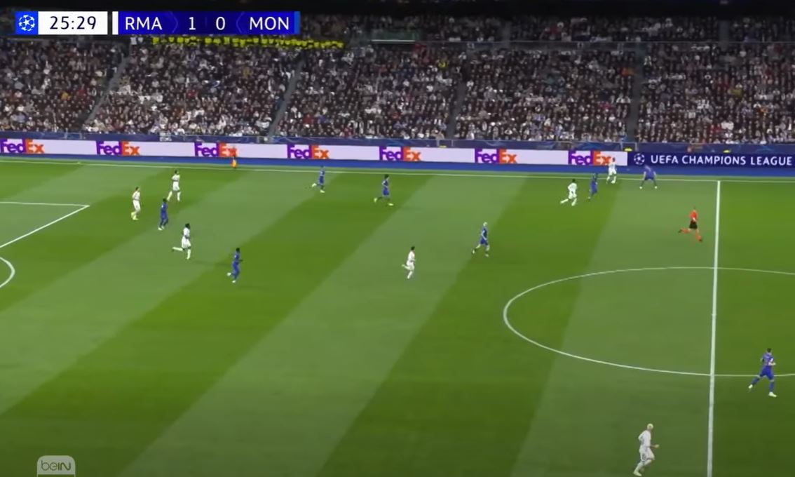 استمر ريال مدريد في هيمنته على المباراة، وسجل مبابي الهدف الثاني في الدقيقة 26 بعد تمريرة أرضية من فينيسيوس، ليصبح أول لاعب يسجل 10 أهداف في البطولة هذا الموسم، بينما حاول موناكو الرد بتسديدة من جوردان تيزيه تصدت لها العارضة، وانتهى الشوط الأول بتقدم الملكي 2-0.